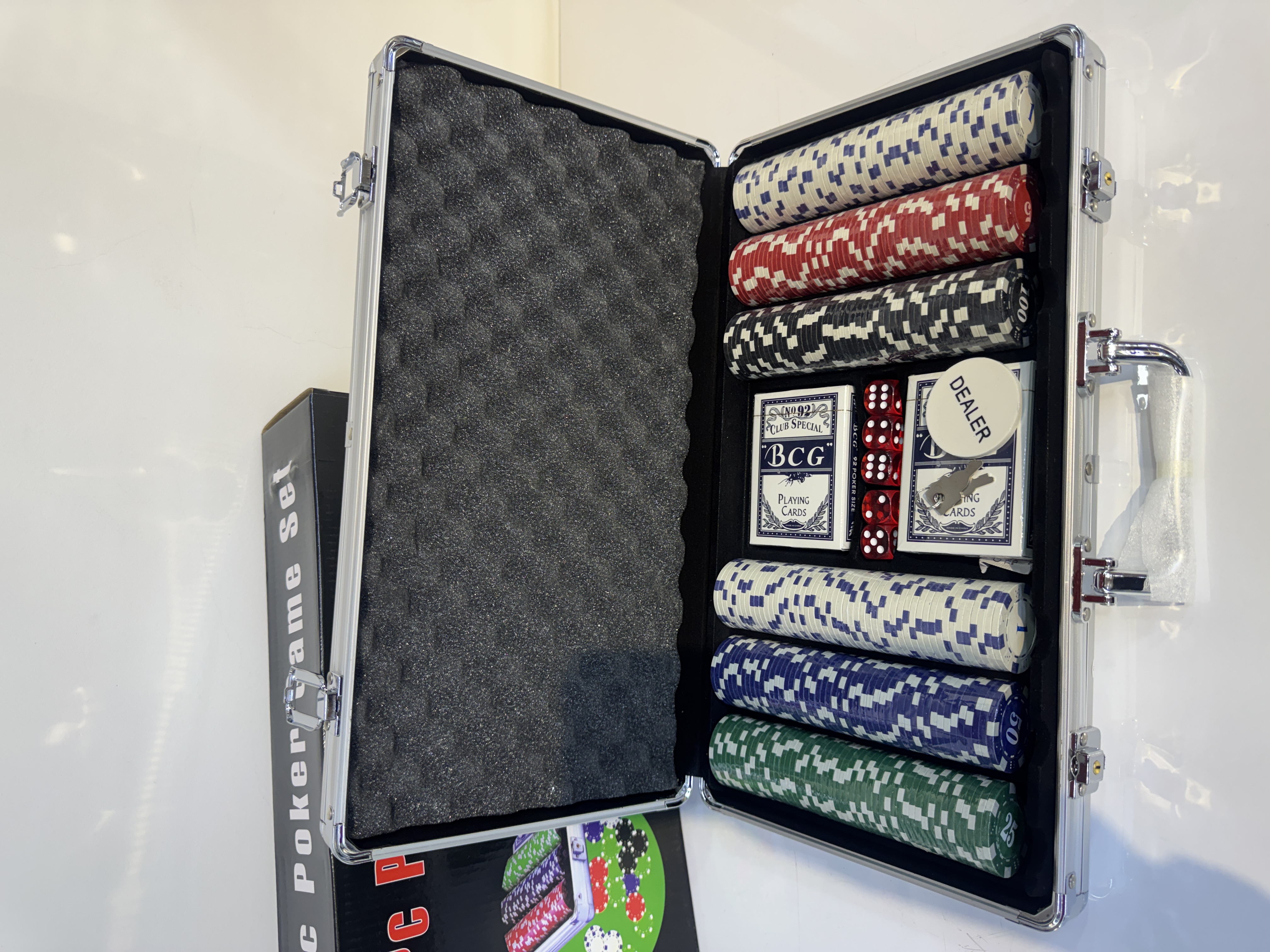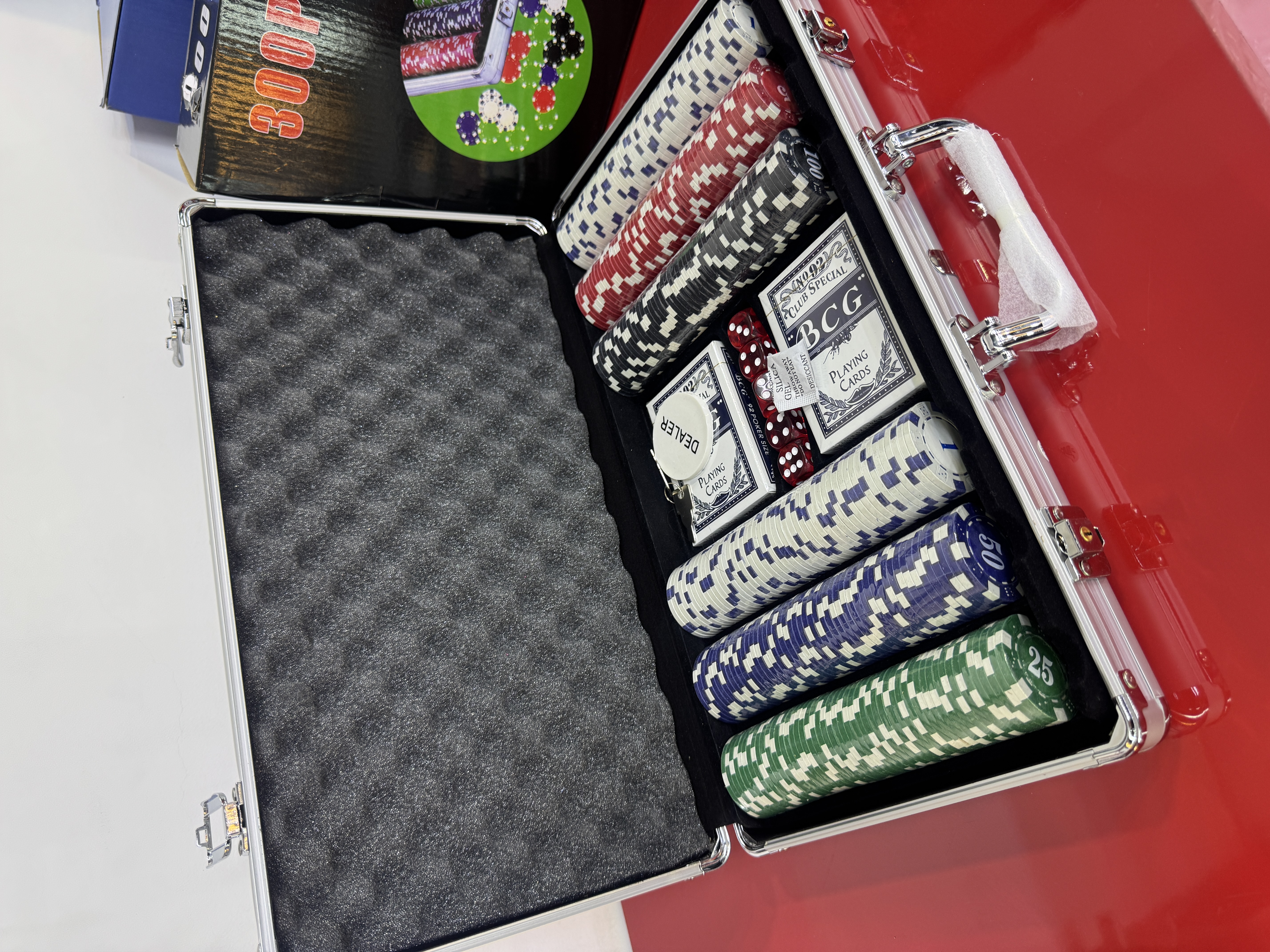 **Incluye:** - **300 fichas profesionales:** Elaboradas con materiales duraderos y diseño sofisticado, perfectas para sesiones intensas de póker. - **1 ficha dealer:** Marca al repartidor con estilo durante cada partida. - **2 barajas de juego:** Barajas premium para una experiencia de juego fluida y profesional. - **5 dados:** Para complementar con juegos adicionales y variaciones. **Características del Estuche:** - Material: Aluminio resistente y ligero. - Diseño tipo maletín con cierre de pestillos para mayor seguridad. - Interior acolchado para proteger las fichas y accesorios. - Asa ergonómica para un transporte cómodo. **Dimensiones del Estuche:** - Tamaño aproximado: 40 x 25 x 8 cm. - Peso total del set: Aproximadamente 4.5 kg. Ideal para grandes reuniones con amigos o familiares, torneos, eventos o noches de juego temáticas. Haz de cada partida una experiencia memorable con este completo set de 300 fichas.