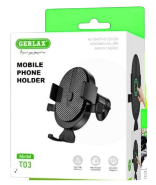 El producto en la imagen es un soporte para teléfono móvil Gerlax Modelo T03, diseñado específicamente para fijarse en las rejillas de ventilación de los automóviles.